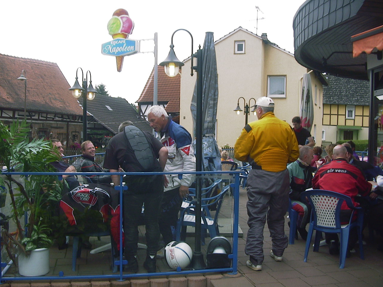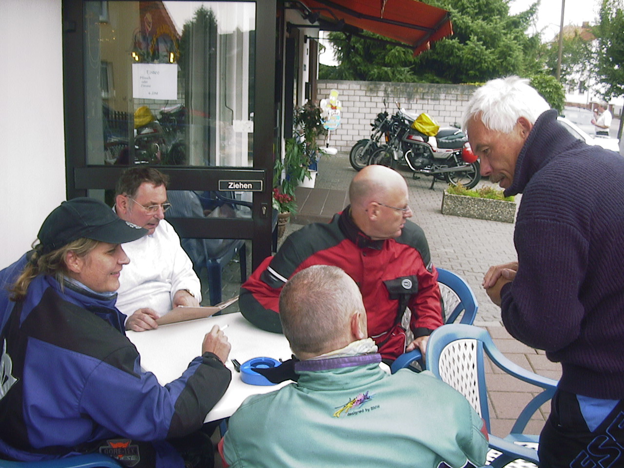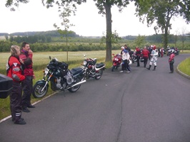 | Dort musste wir eine Pause einlegen, da zwei Motorräder in Leubach die Abfahrt verpass und die Gruppe verloren hatten. Aber ich hatte ja eine genaue Fahrtroute verteilt und sie stießen wenige Minuten später wieder zu uns. Die Wartezeit hatte Gudrun überbrückt, indem sie versuchte Srecko einen Walzer beizubringen. |