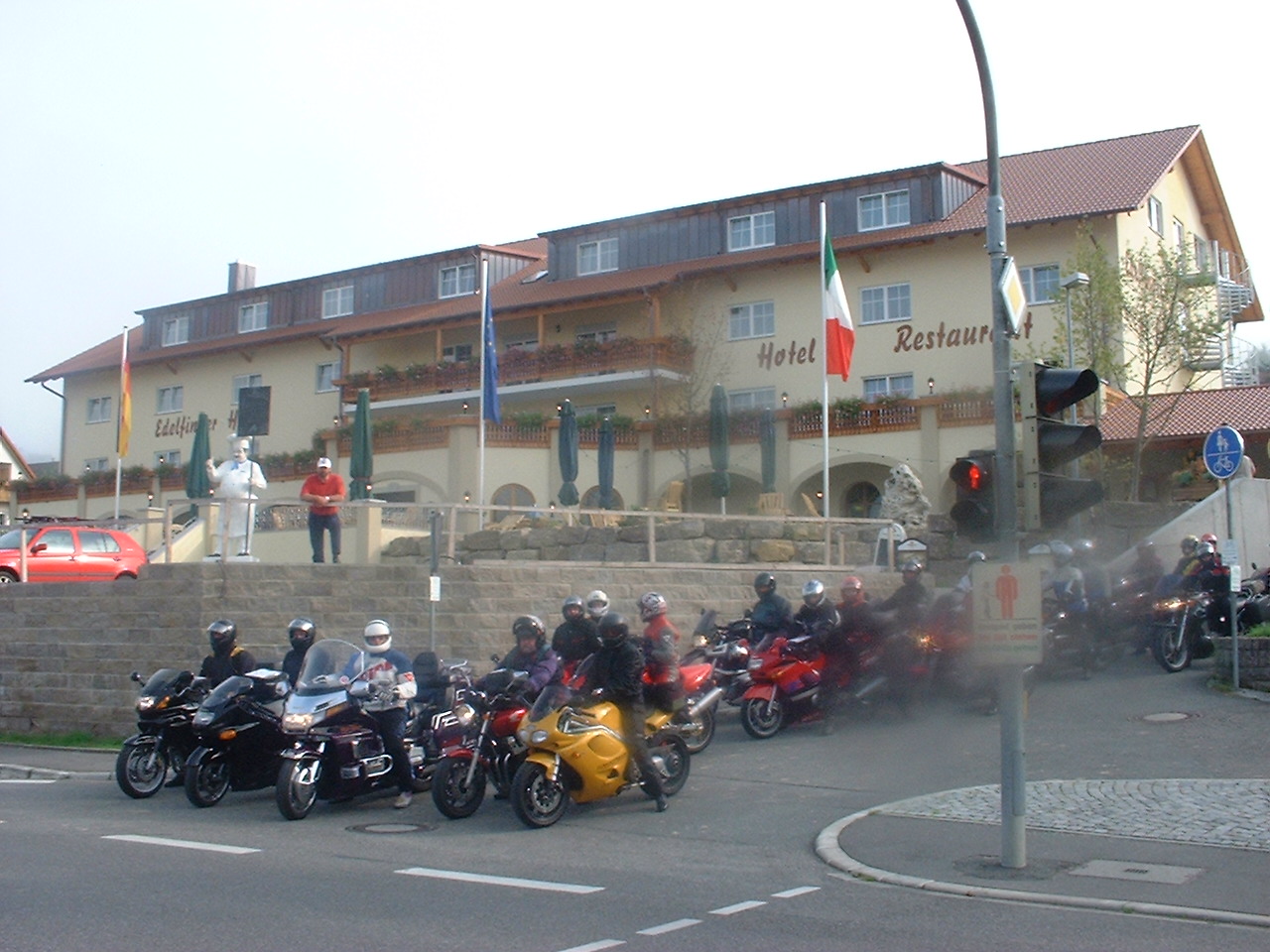 Ein herrliches goldenes Oktoberwochenende war angekündigt, aber bei 10°C war es recht frisch. Weiter ging es über Lauda (B290) bis Edelfingen. Im Landgasthof „Edelfinger Hof“ wartete bereits ein reichhaltig gedeckter Frühstückstisch auf uns. |