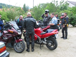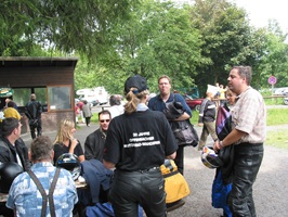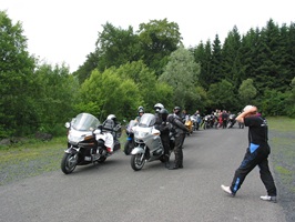 | Gegen 10:00 h ging es weiter über Jossgrund - Burgjoss - Fellen - Burgsinn - Rossbach - Wernarz - Bad Brückenau - Riedberg - Eckartsroth - Wildflecken - auf der B279 links nach Gersfeld zum Tanken. Von dort über die B248 über Obernhausen (ich glaube hier war das Stück, wo jeder dachte dass wir uns verfahren hätten da wir einen ewig langen Waldweg, der nur geschottert ist, befuhren) Abtsroda - Sieblos bis Tränkhof. Im Restaurant "Alt-Tränkhof" (Telefon: 06658-274) kann ich mich noch an ein sehr leckeres Buffet für 12,20€ erinnern. Wurde da Alex mit Gewalt wieder aus dem Lokal |