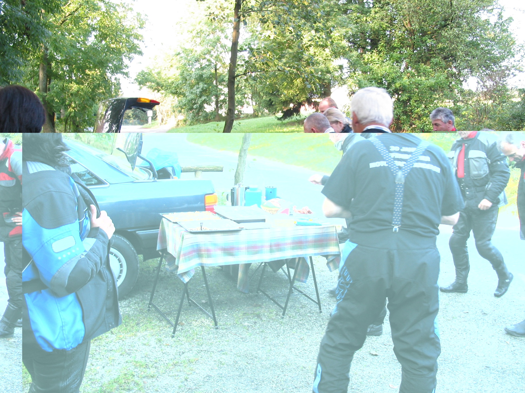 | Dort erwartete uns ein super organisiertes Frühstück. Mike hatte seine ganze Familie mit eingespannt die auf dem Parkplatz bereits auf uns wartete. Kaffee, Tee und Säfte sowie mehrere Bleche mit frischem selbstgebackenem Kuchen.Ja wer nicht dabei war kann zurecht neidisch werden. Ein besonderer Dank für die Unterstützung und das Engagement !!! |