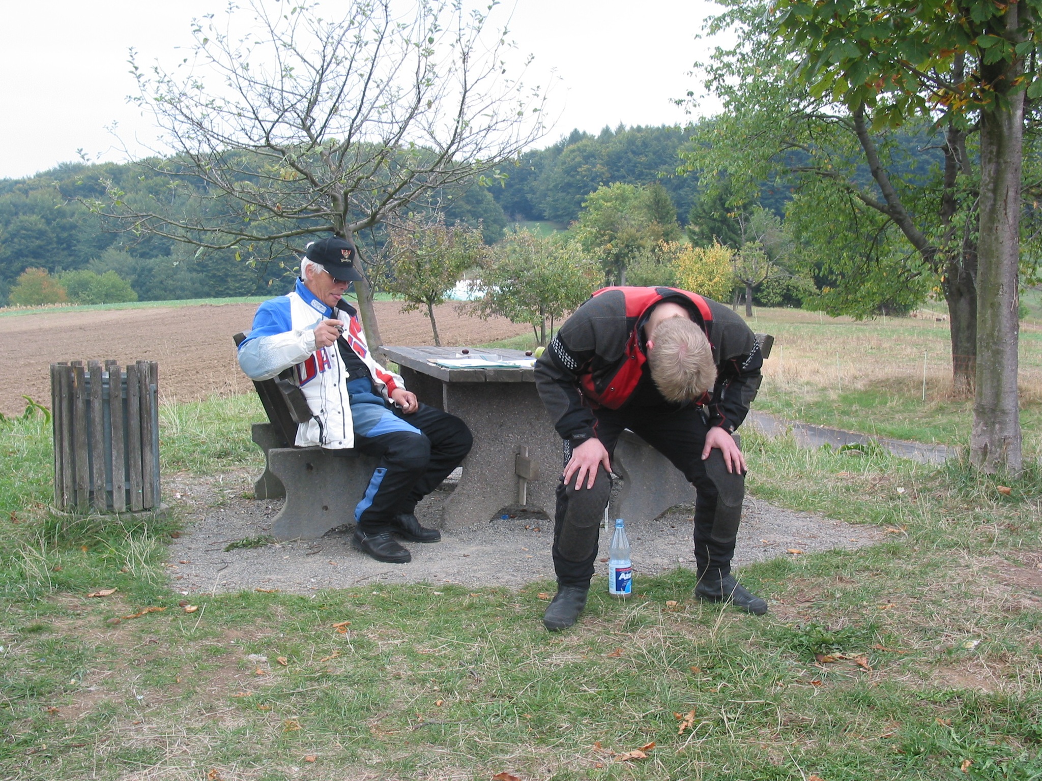 schon eine Zeit zurück und man wunderte sich, was da heute so alles für "dummes Zeug" gefragt wird. Diese drei Fragebogen zu beantworten brachte so manchen ins Schwitzen.Aber wir hatten alle viel zu lachen und es war ein schöner Tag. Nur zum Abschluss hatten wir noch eine kleine Panne, da Werner eine Schraube im Reifen hatte, welche wir entfernten und den Reifen flicken mussten.