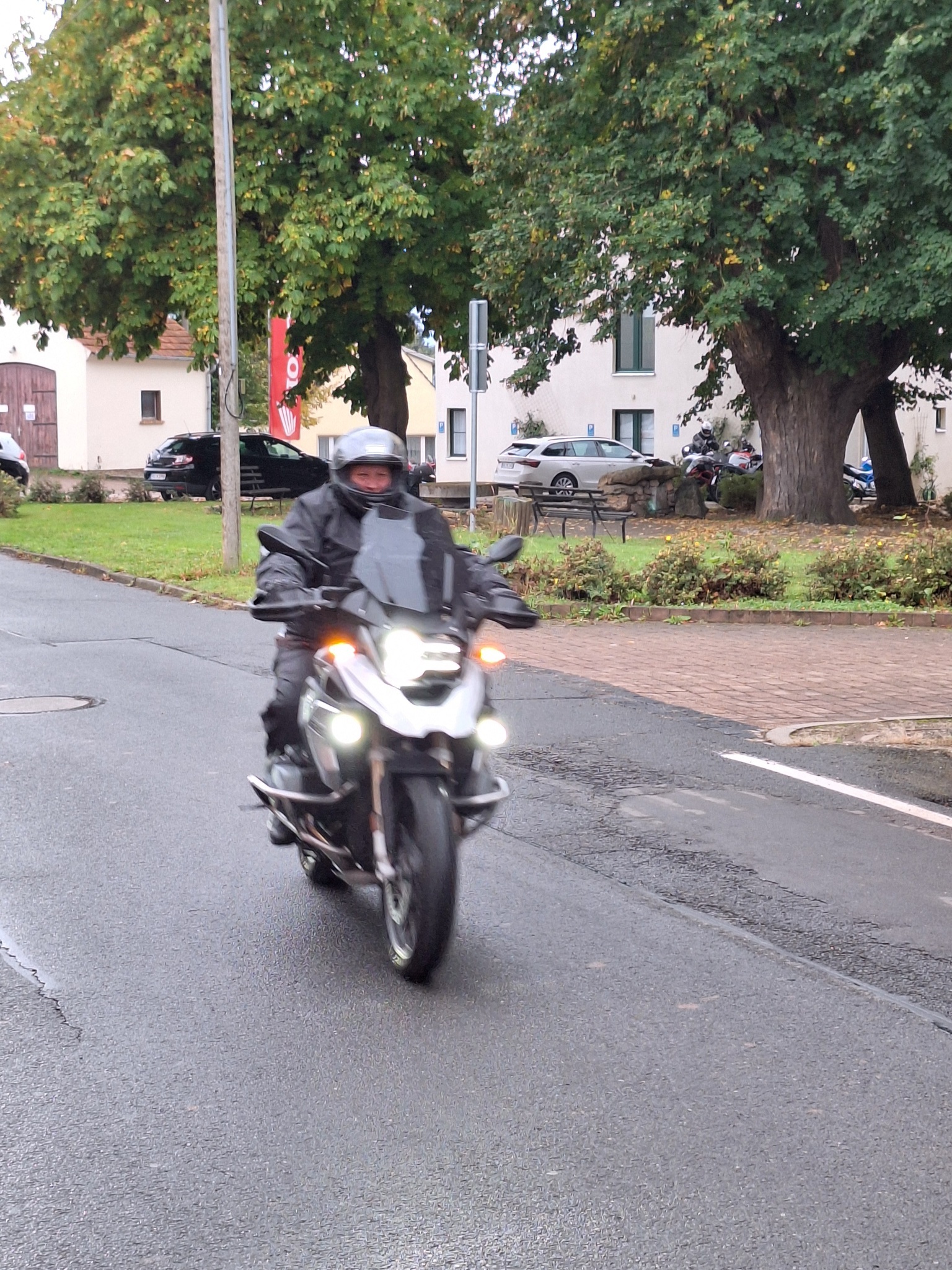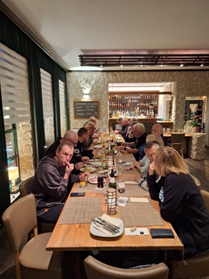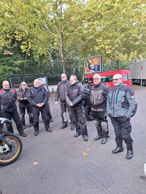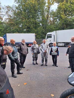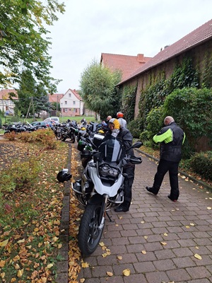 Los ging es wie immer auf dem Parkplatz am OFC Stadion. Wolfgang hatte für uns eine schöne Tour durch den kurvenreichen Vogelsberg, den Kellerwald und den Südharz geplant. Wir waren überwiegend auf kleinen Straßen unterwegs. Die Wetterprognosen waren wieder mal nicht gerade rosig. Aber wir haben die ca. 350 km trockener Achse geschafft. Es war nur ziemlich kühl. Im Hotel angekommen, tranken wir das Garagenbier sogar auf der Terrasse. Allerdings wäre ein Glühwein auch nicht schlecht gewesen. Den Abend ließen wir im warmen Inneren des Hotels bei einem leckeren Abendessen vom Buffett ausklingen. Am Abend und in der Nacht kam dann leider der Regen.