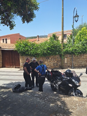 Am folgenden Tag war Hans unser Tourguide und führte uns Richtung Nordwesten. Er hatte auch eine sehr schöne Tour geplant. Wie bei den anderen Touren konnten wir die Kurven und die Landschaft Sardiniens bestaunen. Wieder im Hotel angekommen ließen sich einige ein kühles Bierchen schmecken, andere hüften in den Pool. Alle wollten Abkühlung. Motorrad fahren auf Sardinien ist schon sehr anspruchsvoll und alle merkten die Hitze (teilweise über 33 Grad). Bei einem gemütlichen Abendessen ließen wir den Tag ausklingen. Am folgenden Tag war Thomas K. unser Tourguide. Er hatte sich vorgenommen den Lago di Mulargia zu umrunden. Leider kam ihm eine etwas abenteuerliche kleine Straße, die in einer Privatstraße endete, in die Quere. Aber gemeinsam schafften es alle die Motorräder zu drehen und konnten die Strecke unbeschadet wieder hochfahren. Weiter ging es dann auf etwas größeren und kurvenreichen Straßen durch die wunderschöne und abwechslungsreiche Landschaft. Mittagspause machten wir in einem Pub in Barumini. Als wir wieder im Hotel ankamen, genoss jeder seine individuelle Abkühlung (Bier, Pool, Dusche), denn auch dieser Tag war sehr heiß. Am nächsten Tag war Fredi unser Tourguide. Er hatte sich wie alle anderen Tourguides sehr viel Mühe gemacht und eine weitere Tour durch die wundervolle Landschaft Sardiniens geplant. Leider störte eine Frauenstimme den Ablauf der Tour und so endete die Tour bei Sardali. Aber hier konnte man wieder einmal sehen, dass MWOler zusammenhalten und keinen allein lassen. Gemeinsam warteten wir auf den italienischen ADAC. Wir waren alle positiv überrascht, wie super das Abschleppen und die Organisation funktioniert hat. Hilfsbereit stand uns auch der ehemalige Bürgermeister von Mainflingen zur Seite.