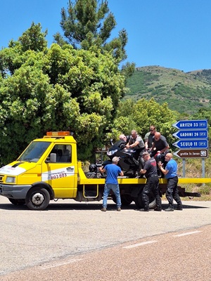Am nächsten Tag hieß es dann Abschied nehmen. Die schöne Zeit auf Sardinien ging leider zu Ende. Den Vormittag verbrachten wir noch im Hotel und machten uns nachmittags auf den Weg zur Fähre. Die Tourführung übernahm wieder Alex. Alle genossen noch einmal die schönen Strecken und die Landschaft, als plötzlich die Gruppe auseinanderriss. Thomas K. hatte leider ein Schlagloch übersehen und zog sich so einen Schaden an seiner Motorradfelge zu. Er konnte nicht weiterfahren. Aber die MWO wäre nicht die MWO, wenn sie keine Lösung gefunden hätte. Es gelang uns KO und Dagmar zu erreichen und so drehten sie kurzerhand um und sammelten Thomas K. und sein Motorrad mit ihrem Anhänger auf. Und so konnten am Abend alle auf der Fähre sein und die Heimreise nach Deutschland antreten.
